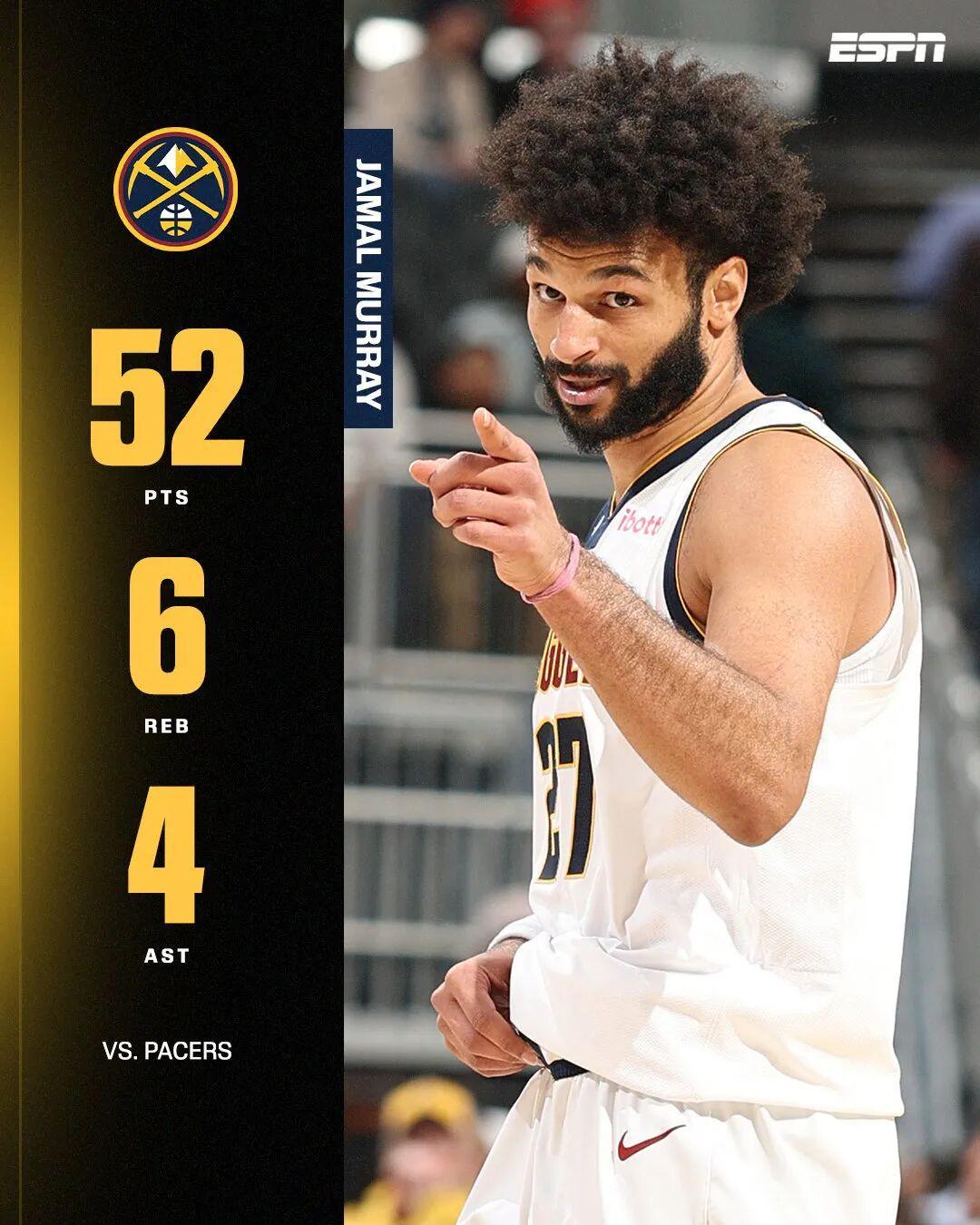 这场比赛,贾马尔穆雷打出了赛季至今最强一战:全场出战36分钟,投篮25中19,三分11中10,罚球5中4,得到52分6篮板4助攻1抢断,他的单场真实命中率达到了95.6%。