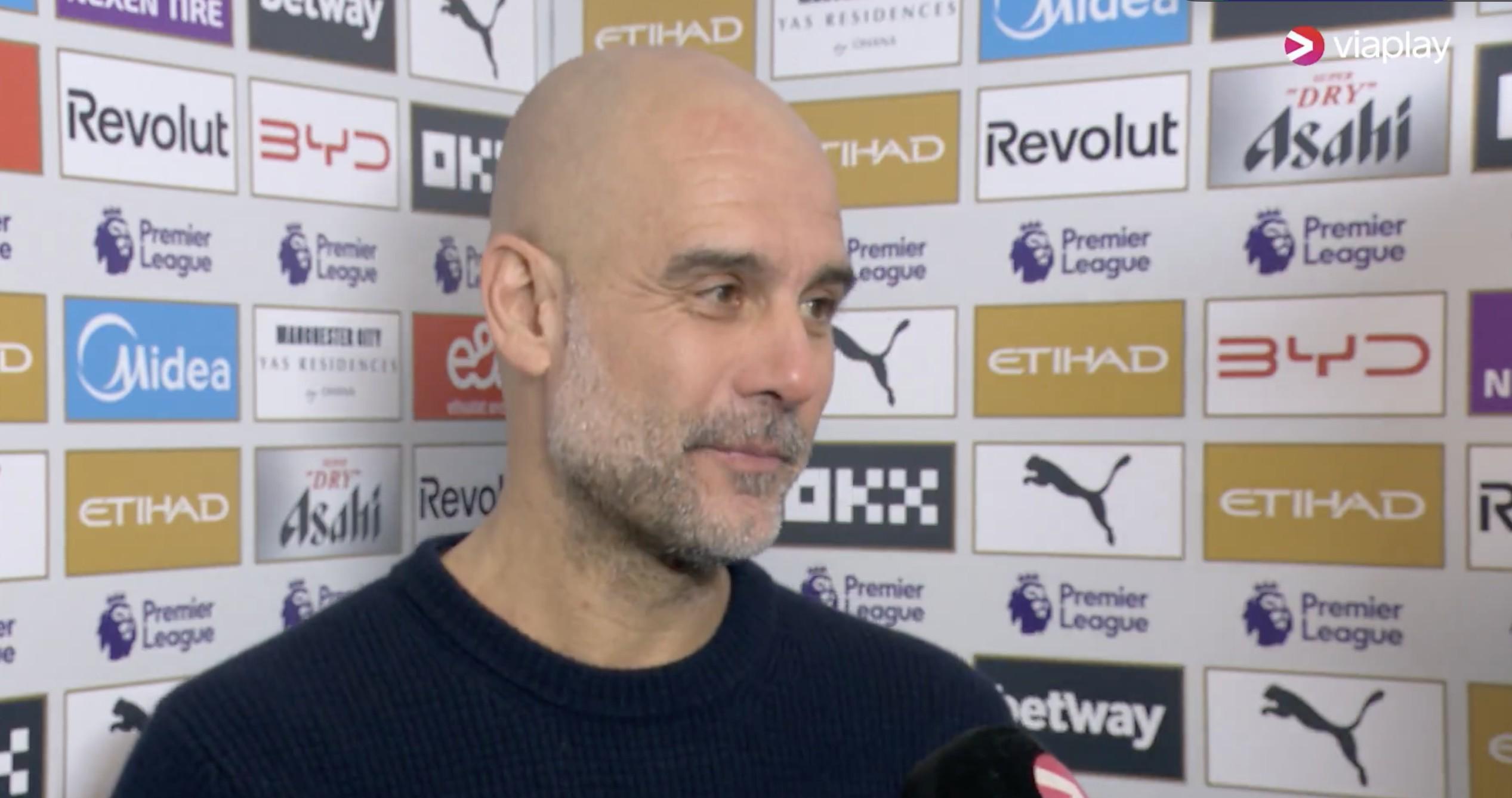 英超第29轮,曼城主场2-2战平诺丁汉森林,赛后,瓜迪奥拉接受了Viaplay Fotball的采访。